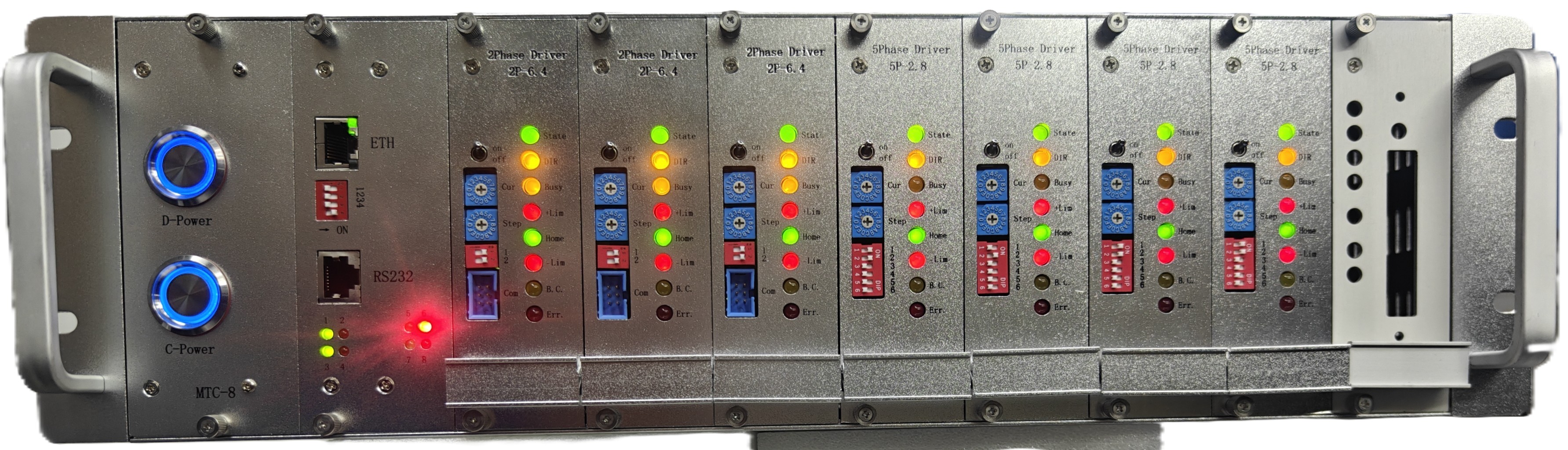 我公司自行研制的高可靠性,高精度一体化运动控制系统,实现控制器,5相驱动器,2相驱动器等整合到一给机箱中。